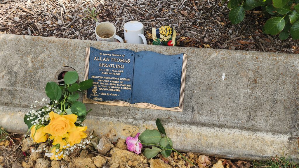 Allan died aged 86, and was buried in the peaceful Sunset Gardens location, which is lined with garden beds filled with colourful flowering shrubs and trees, and positioned to receive the last rays of the sunset each day. His wife Noelle Gertrude (Severino) Spratling joined him at this location in March 2025.