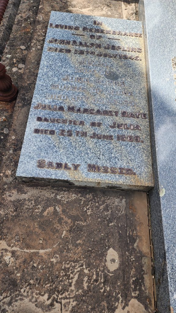 Jack, Julia, and Julia Margaret are memorialised with a simple stone plaque, while John Robertson, Margaret Maria and John James have a hipped stone slab with their names etched on either side. Low-set decorative iron railing surrounds the grave as was the custom of the time it was built.