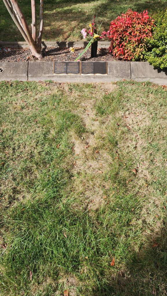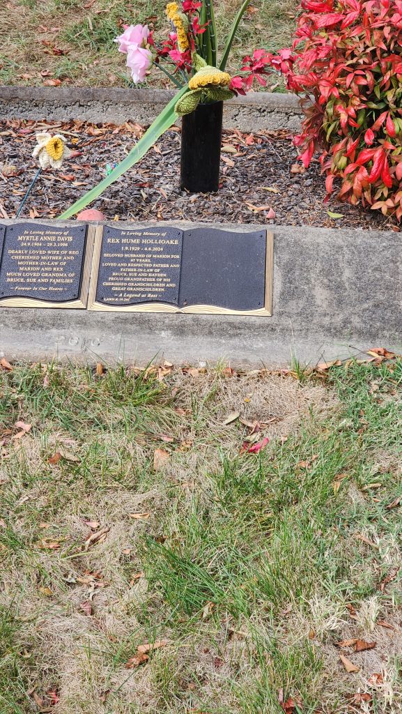 Rex died at the age of 94, and was buried in Lawn K, a lawn location known for its beautiful garden beds and mature plantings of conifers, crepe myrtles, and colourful shrubs. His memorial is marked with a bronze open book design for the plaque. The facing page has been left blank. His wife Marion’s parents Reginald and Myrtle Davis are also interred at this location.